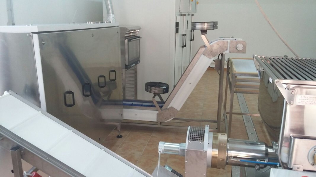 La linea composta da Pressa automatica P/120 doppia vasca da 120 kg/h, nastrino di trasporto per TB/100 Trabatto per la prima asciugatura, n. 2 Essiccatoi statici mod. VR/50 controllati da PLC con telai e carrelli con canne per pasta lunga.